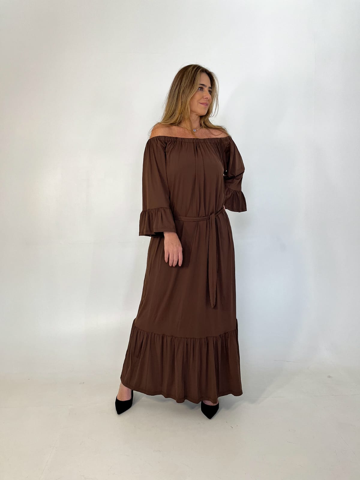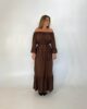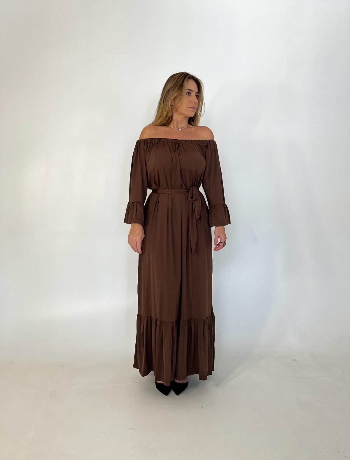 O decote com elástico franzido permite um caimento delicado e confortável, além de dar aquele toque característico da modelagem cigana. O vestido é amplo e fluido, proporcionando liberdade e frescor.