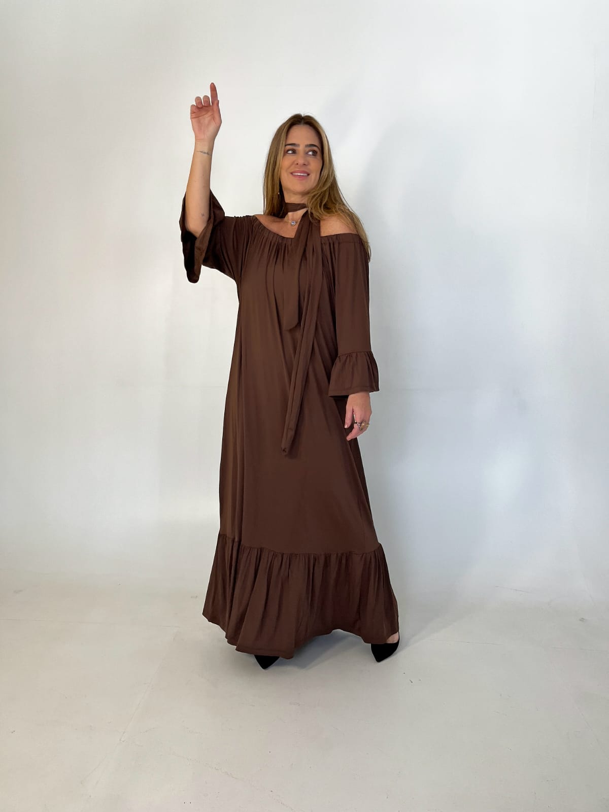 O Vestido Fluity Cigana traz leveza e estilo em um modelo super feminino e versátil. Confeccionado em fluity, ele possui mangas 7/8 com babado, além de um babado na barra que dá movimento e charme à peça.