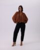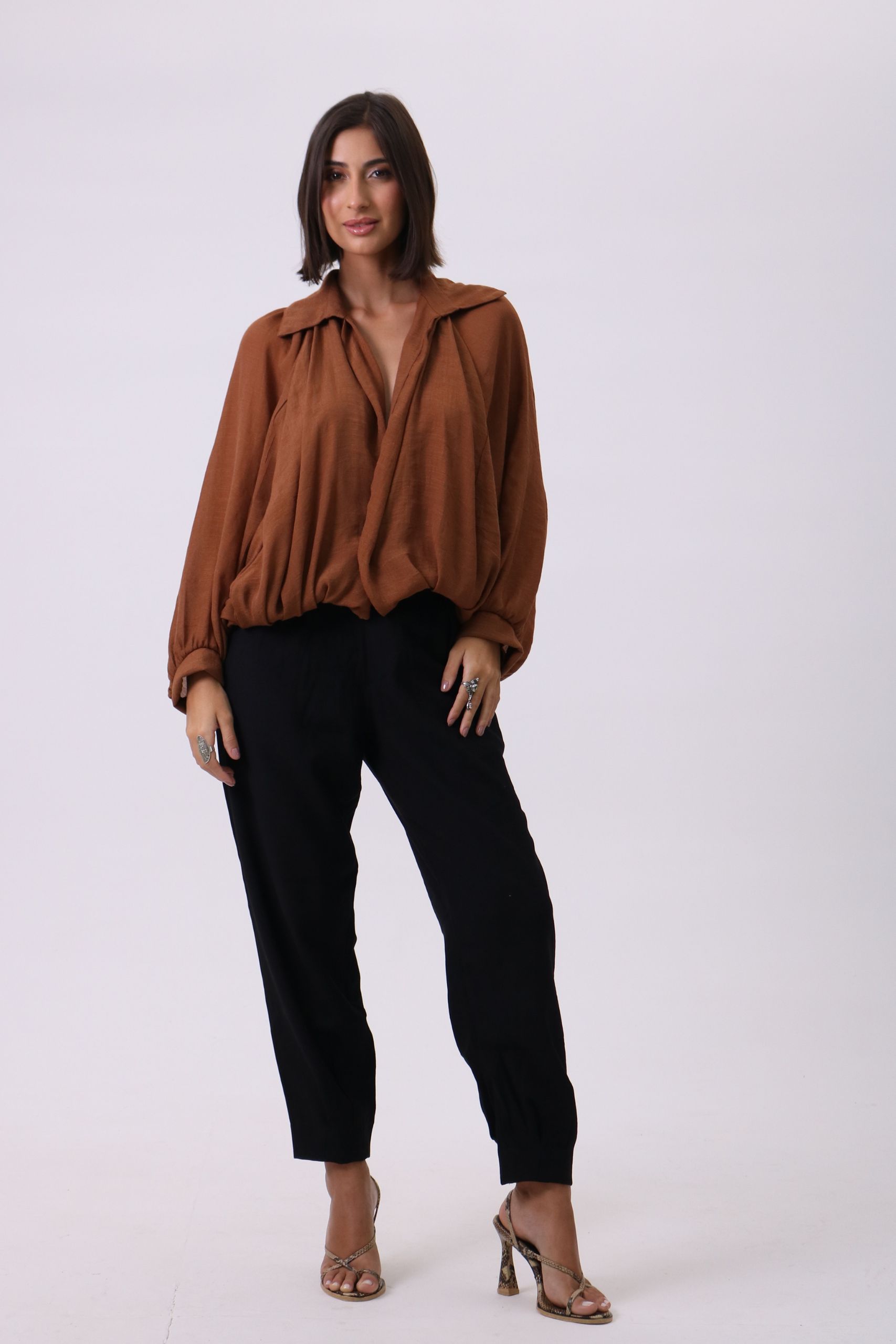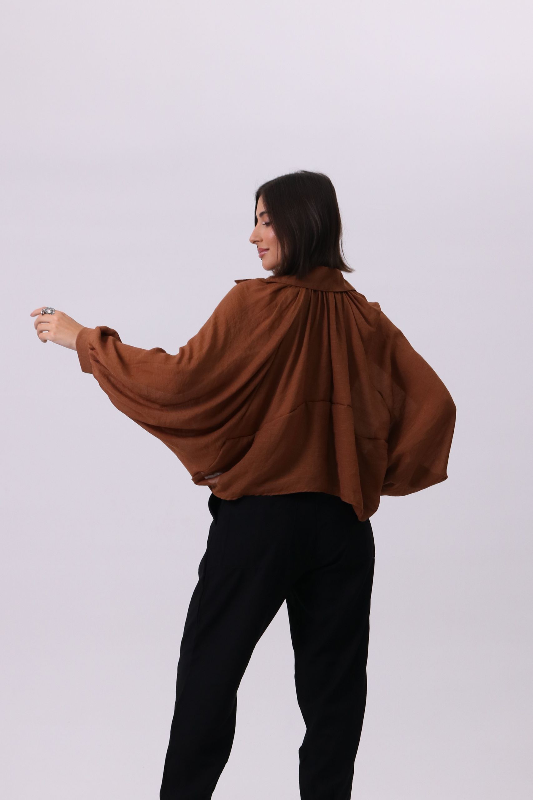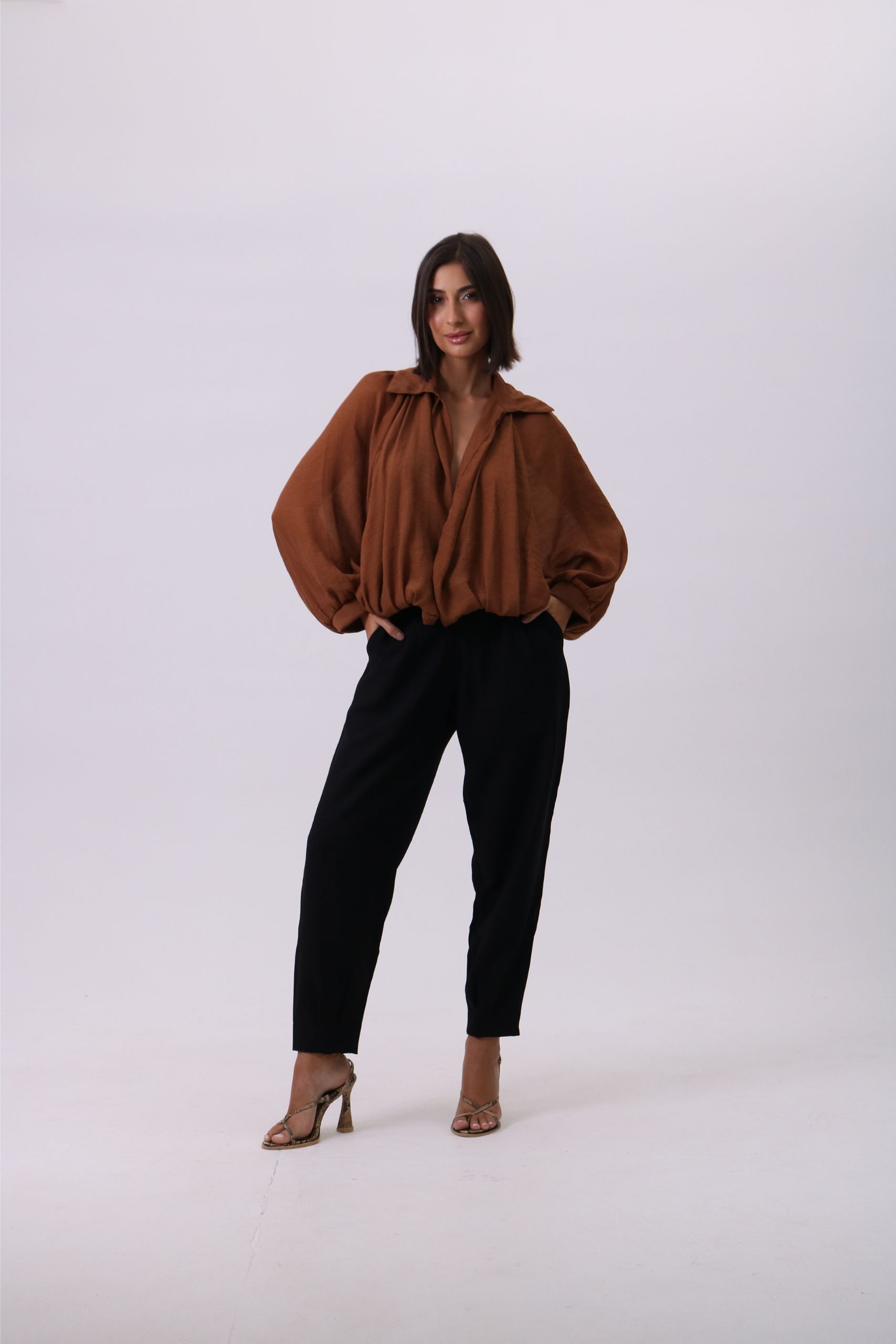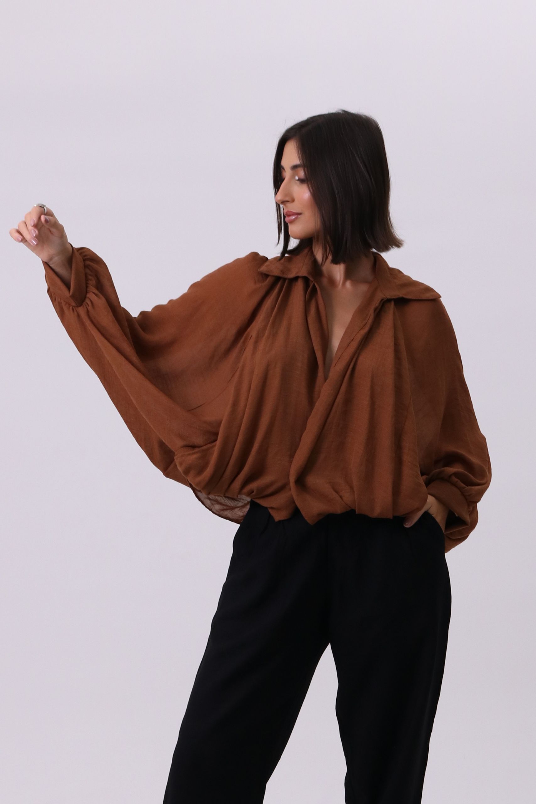 A Blusa Zim é marcante e cheia de personalidade, ideal para composições modernas com um toque fashionista. Confeccionada em viscose com poliéster, a peça possui estrutura leve com caimento levemente encorpado, criando o efeito abaulado que traz volume na medida certa. O comprimento curto valoriza a silhueta e dialoga perfeitamente com peças de cintura alta, enquanto a manga morcego adiciona amplitude e um visual contemporâneo.