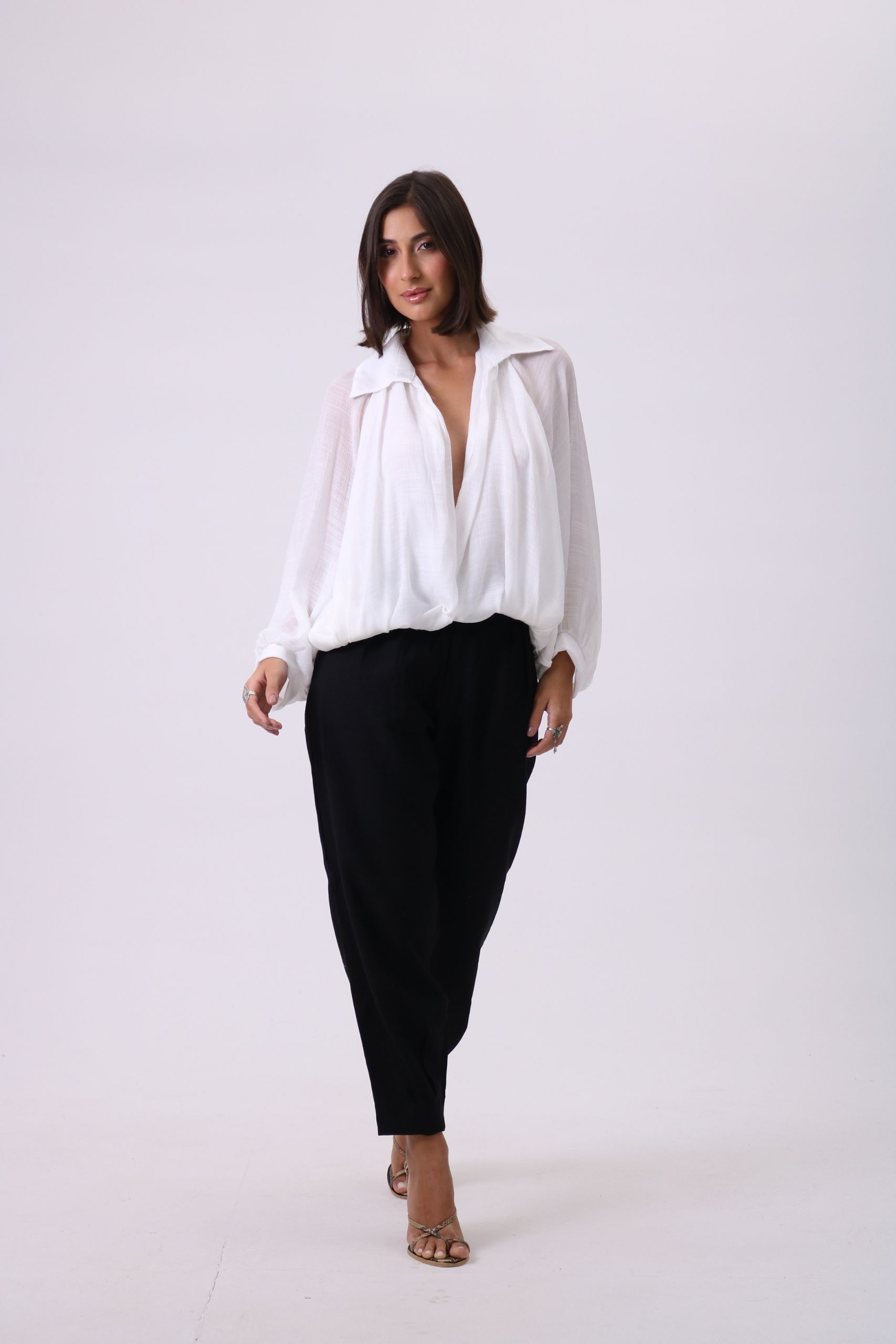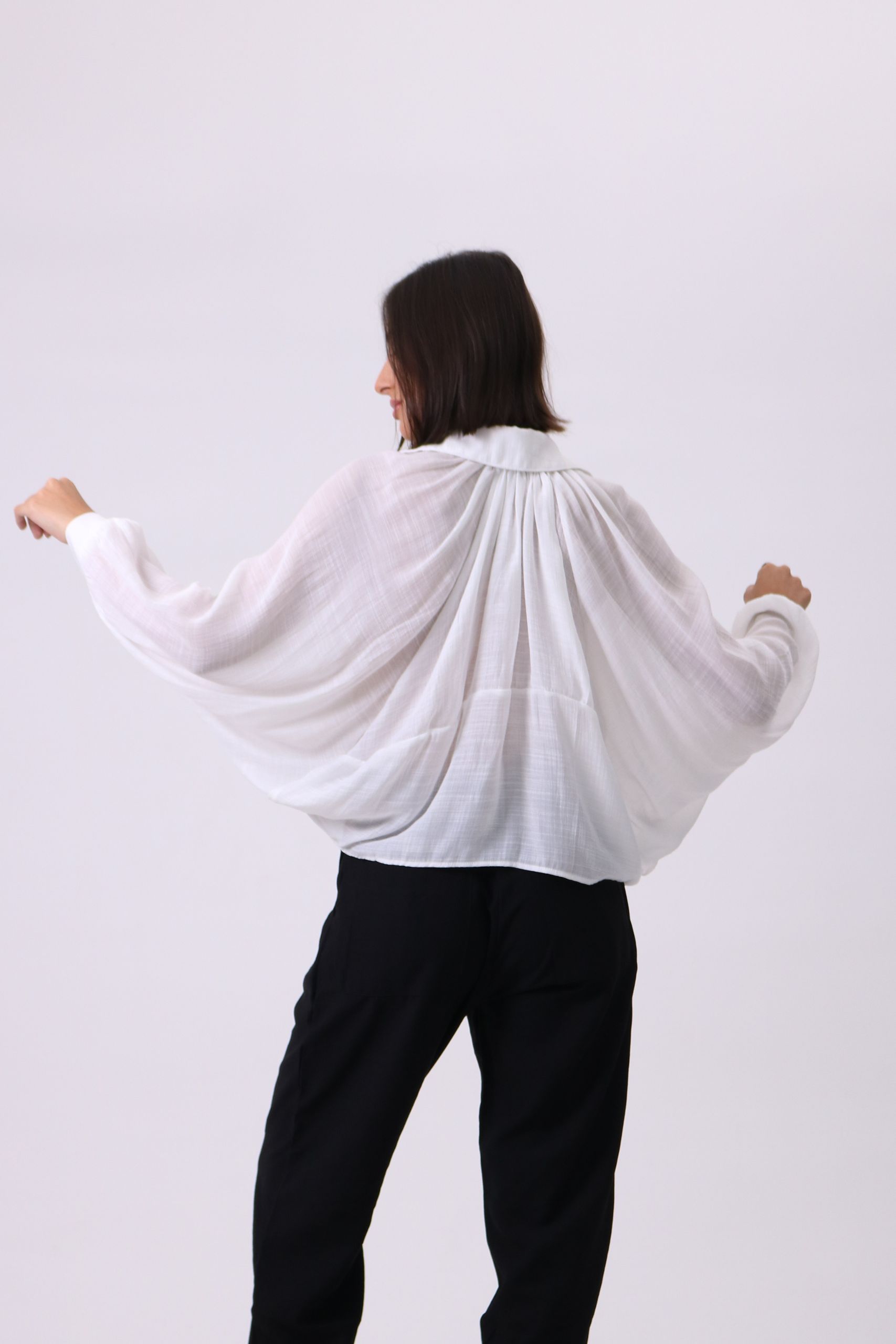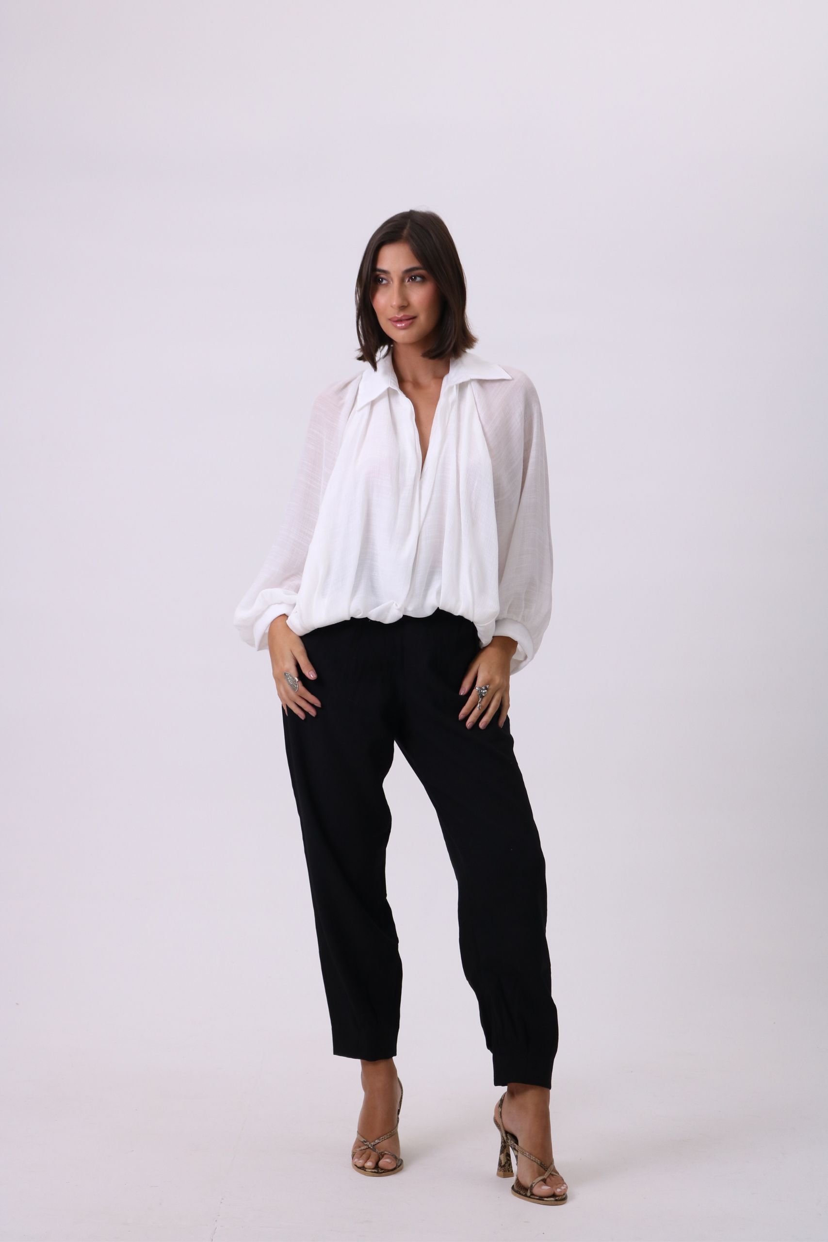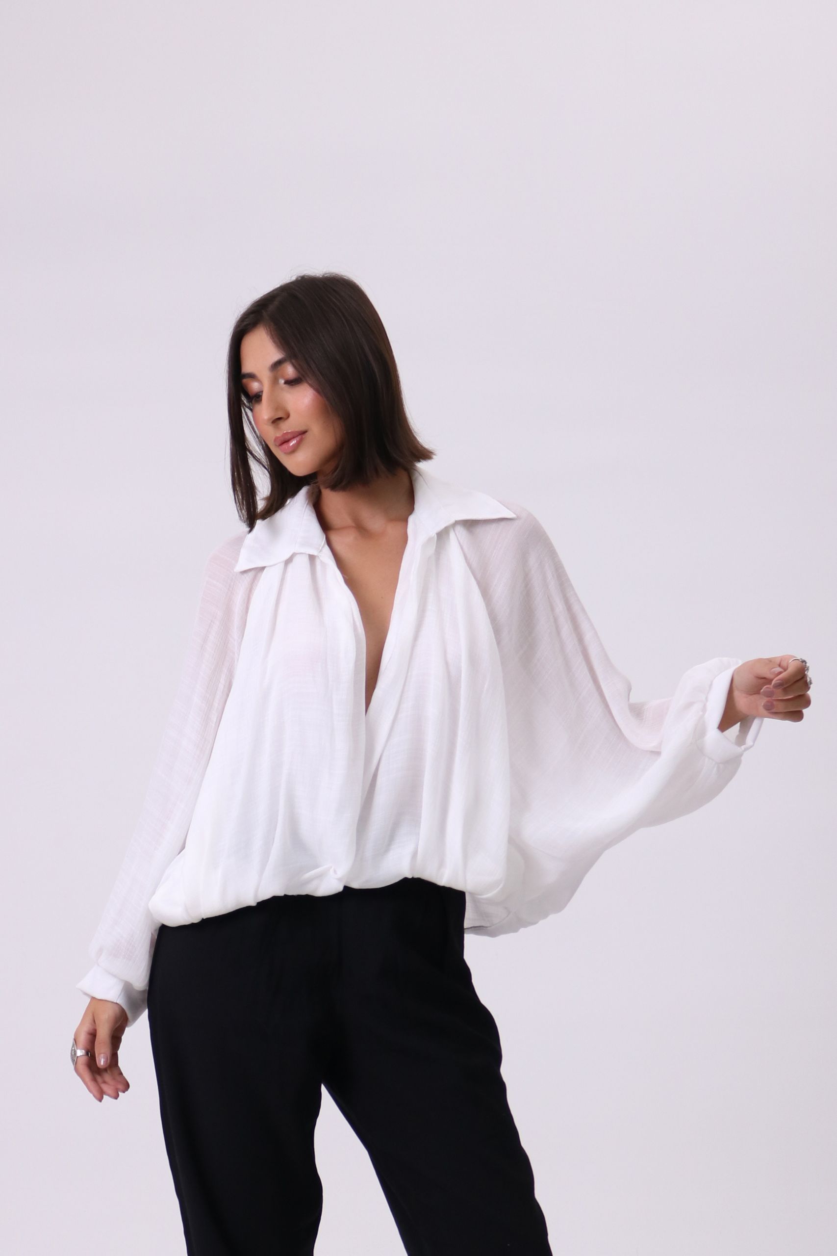A Blusa Zim é marcante e cheia de personalidade, ideal para composições modernas com um toque fashionista. Confeccionada em viscose com poliéster, a peça possui estrutura leve com caimento levemente encorpado, criando o efeito abaulado que traz volume na medida certa. O comprimento curto valoriza a silhueta e dialoga perfeitamente com peças de cintura alta, enquanto a manga morcego adiciona amplitude e um visual contemporâneo.