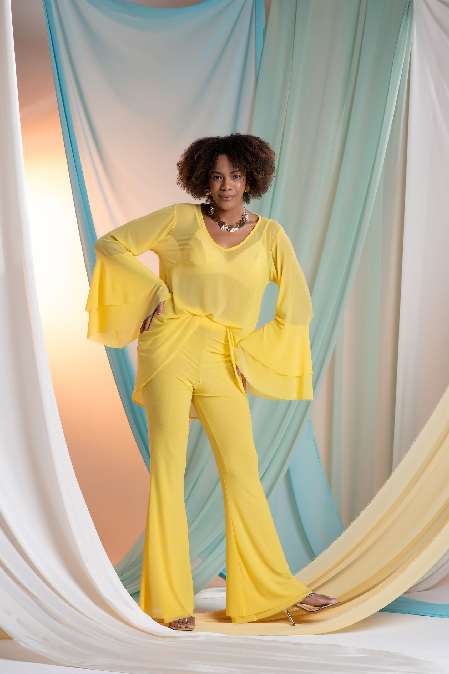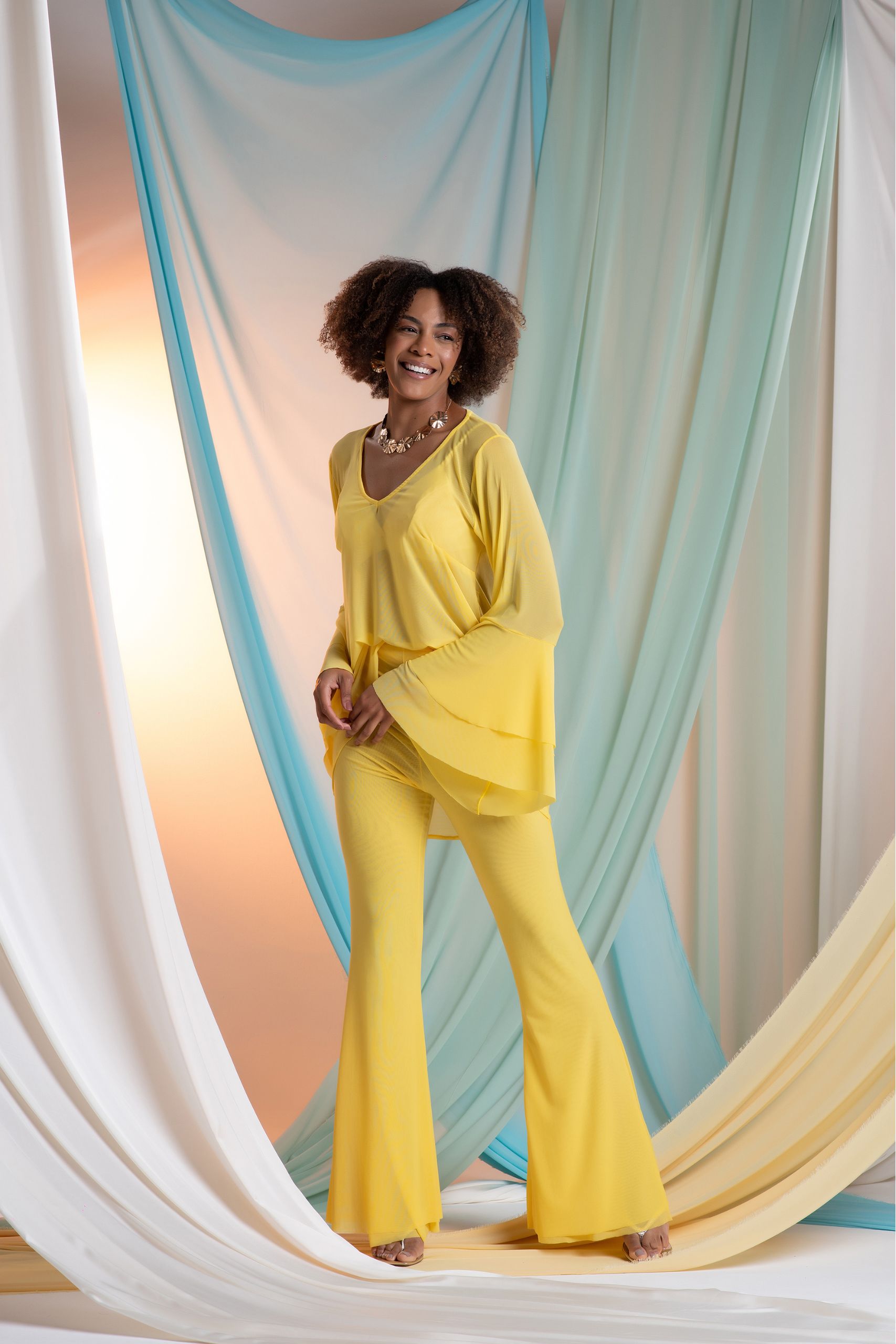 A Calça Tule Cordoba traz toda a modernidade do tule misturado a elegância da calça reta. Possui modelagem reta, com um pouco mais de ajuste na coxa. É uma peça leve e extremamente versátil.