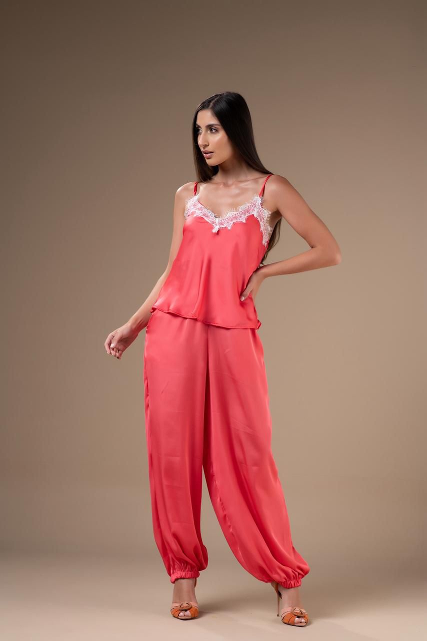 A Calça Versailles é confortável e versátil . Confeccionado no cetim,  a modelagem possui caimento fluido e amplo, com destaque especial para o detalhe mais justo no tornozelo. Esse modelo de calça, conhecido como Aladdin, foi muito visto nas fashion weeks e é uma grande tendência.