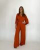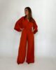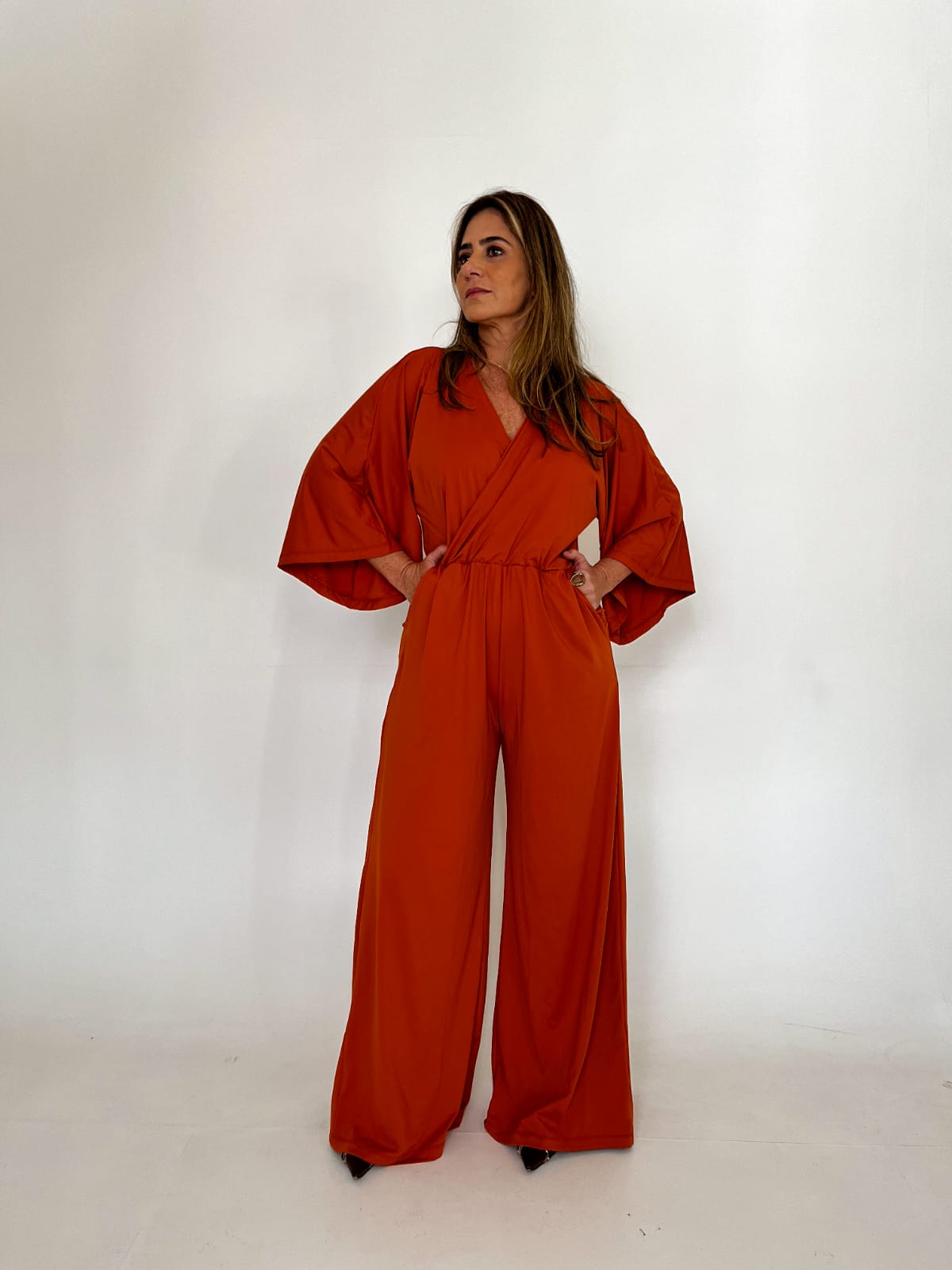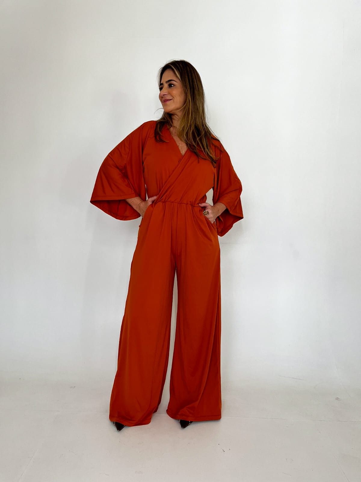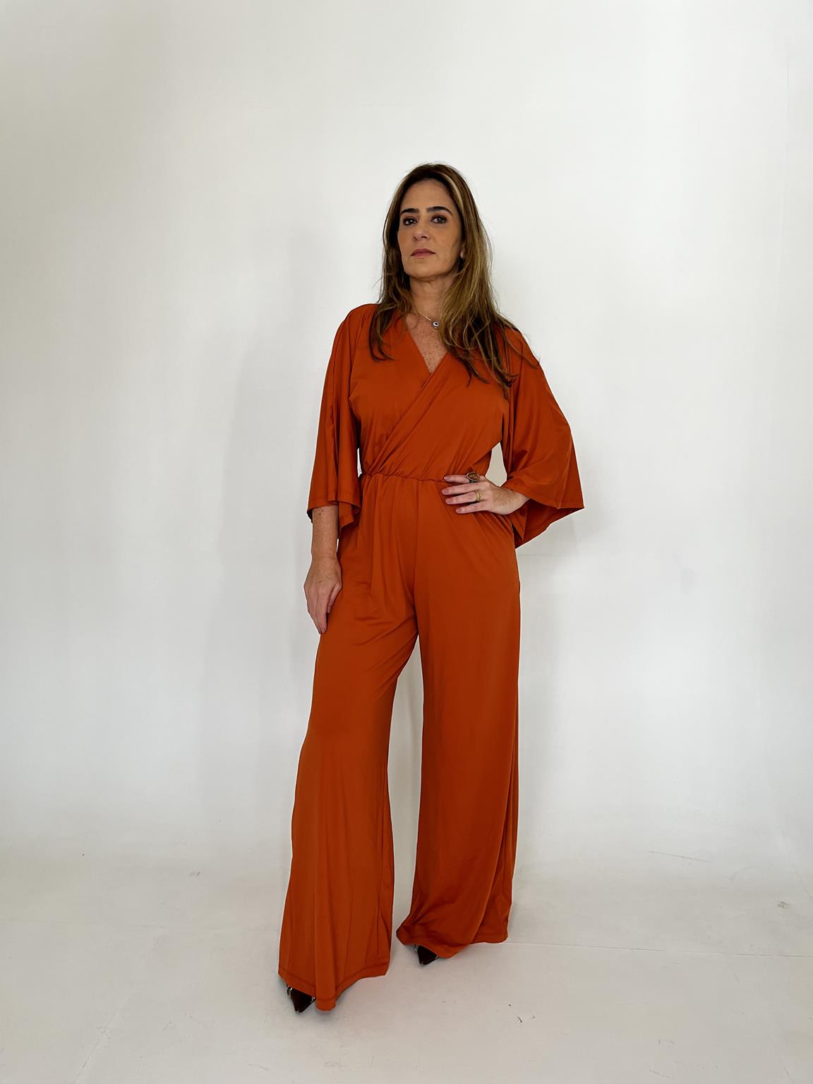 Macacão fluity com blusa trespassada, manga ampla e elástico na cintura. Acompanha faixa do mesmo material. Clássico Hill da coleção Eternos.