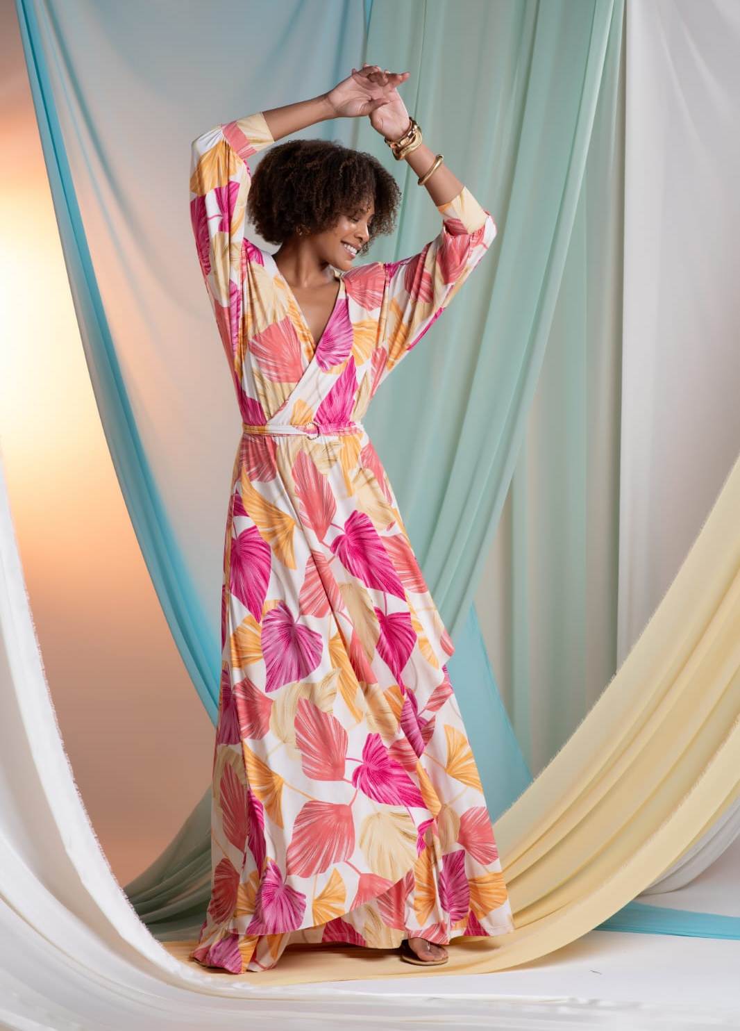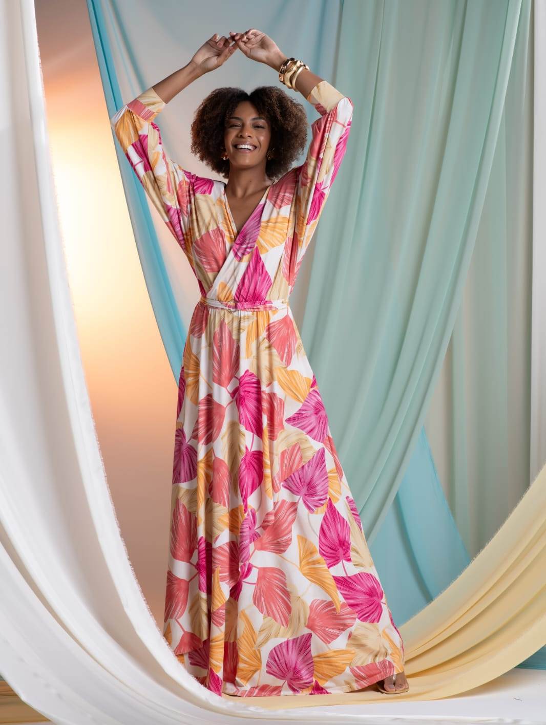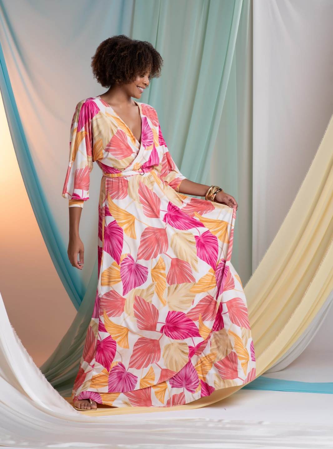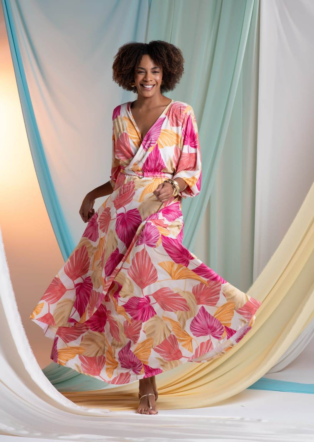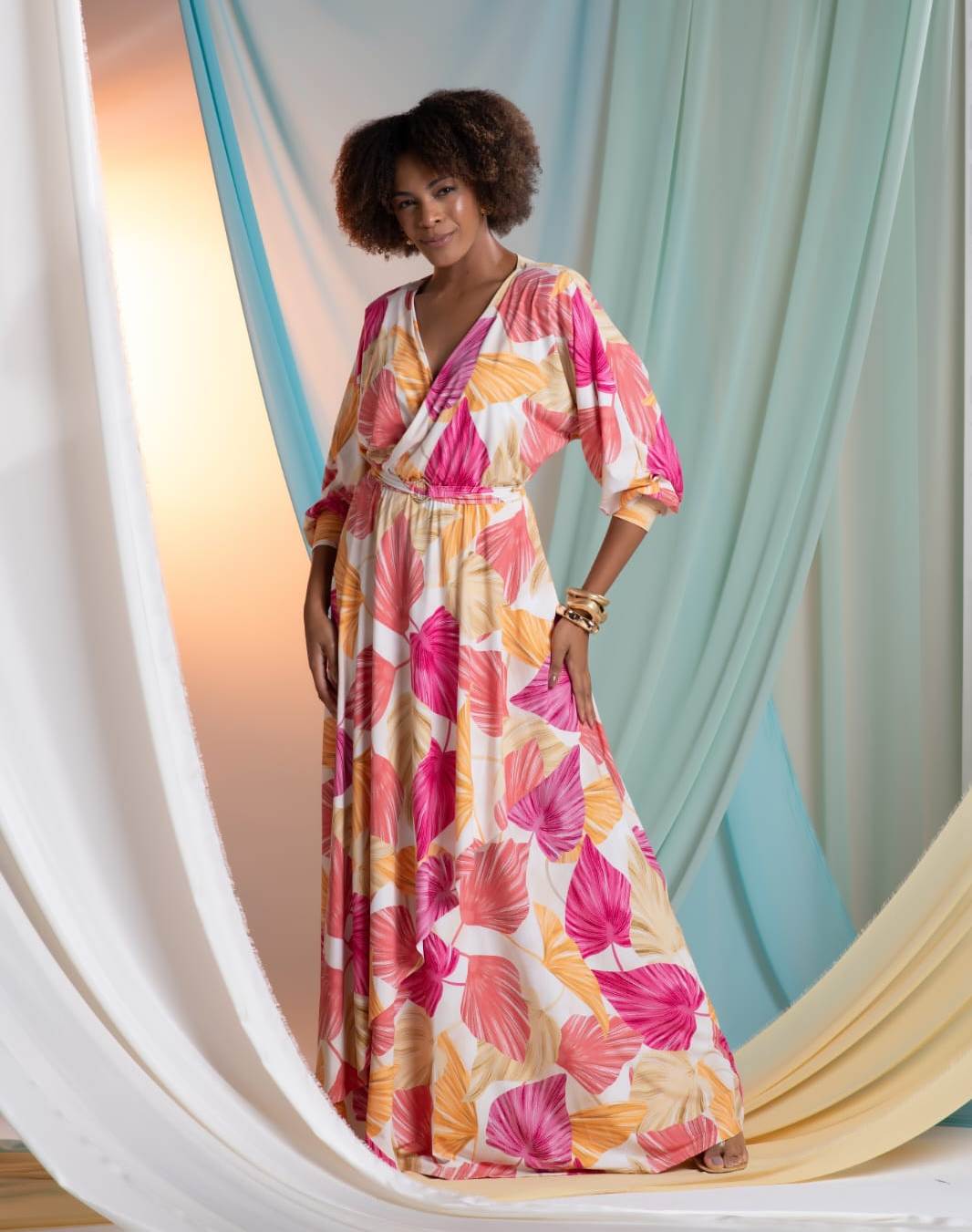 O trespasse frontal cria um decote sofisticado e a manga 3/4 traz elegância. A modelagem valoriza a silhueta de forma elegante, confortável e atemporal.