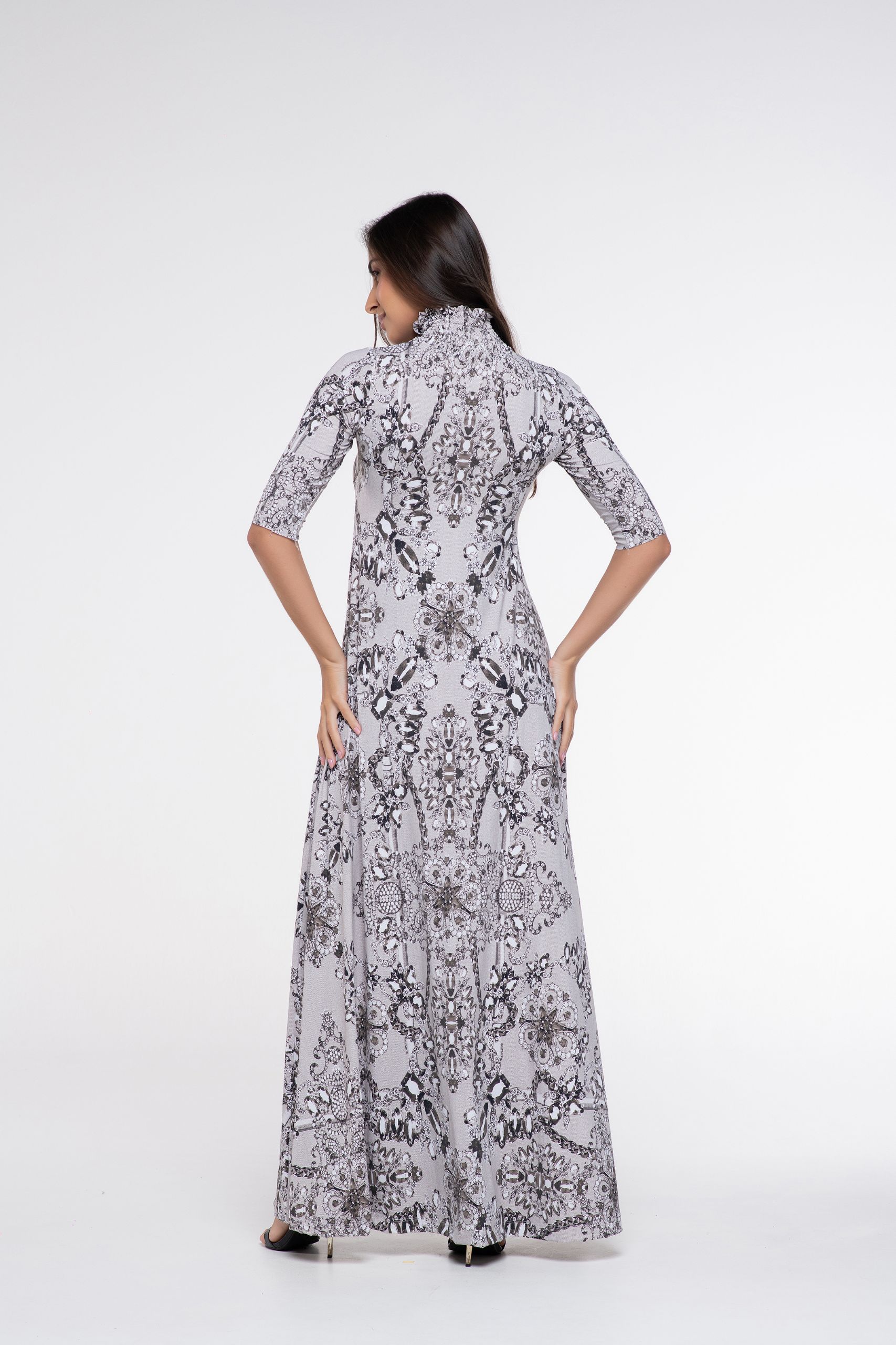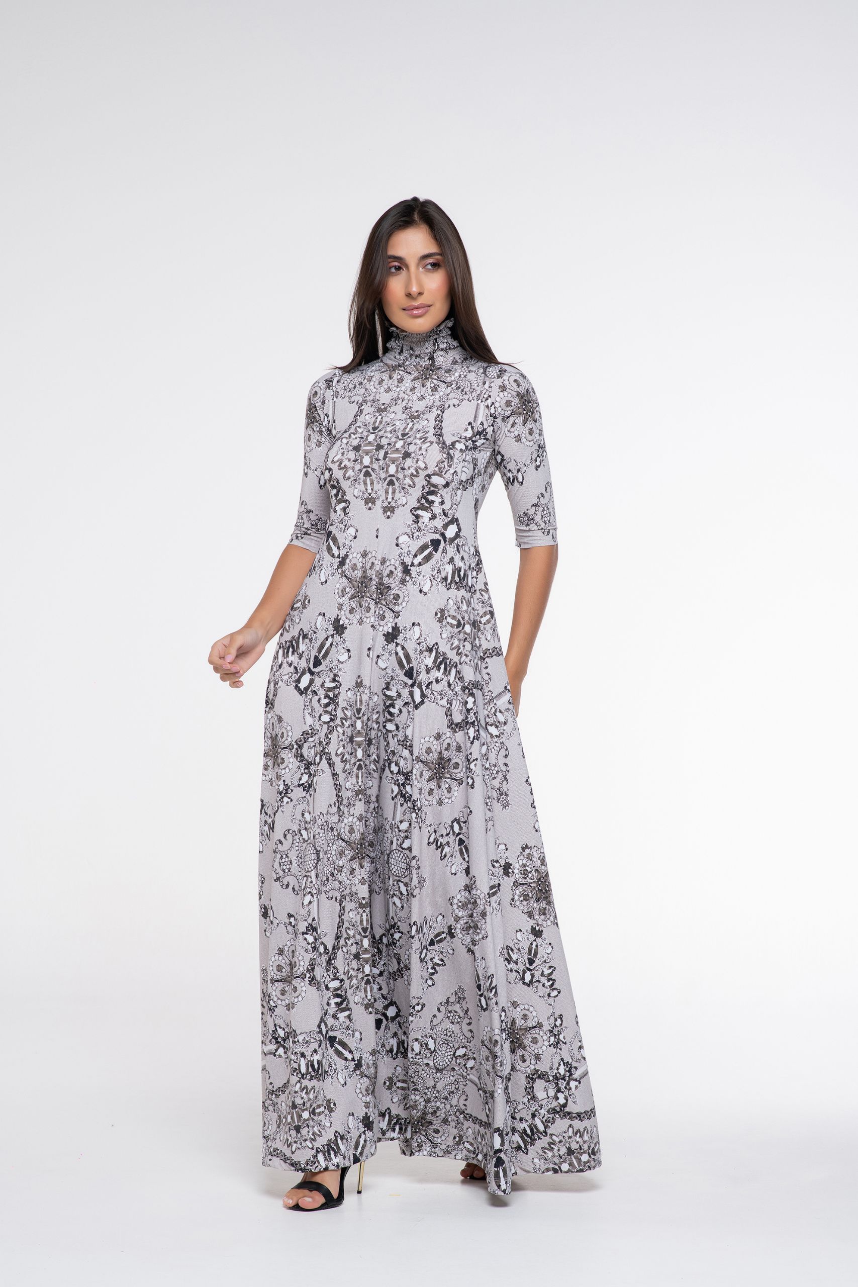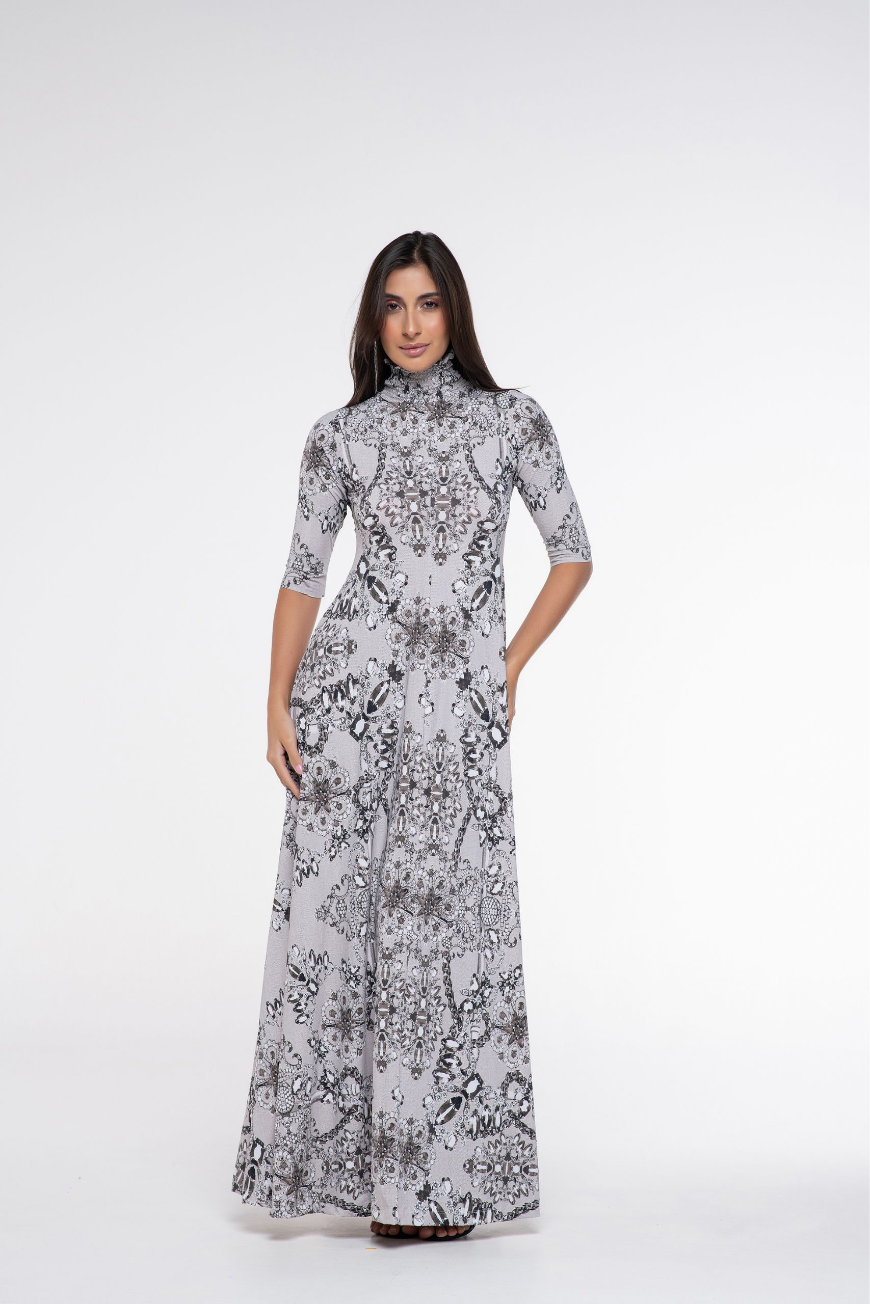 O Vestido Fluity Pedra é marcante e cheio de estilo, perfeito para produções que valorizam cor e movimento. Confeccionado em fluity estampado, a peça apresenta superfície suave e leve, com padronagem que traz personalidade ao look. A gola alta com acabamento em lastex proporciona ajuste confortável e um efeito levemente franzido, criando textura na parte superior. As mangas 2/4 equilibram a proposta e tornam a peça prática para diferentes ocasiões, enquanto o comprimento longo reforça um visual elegante e atual.