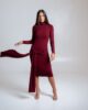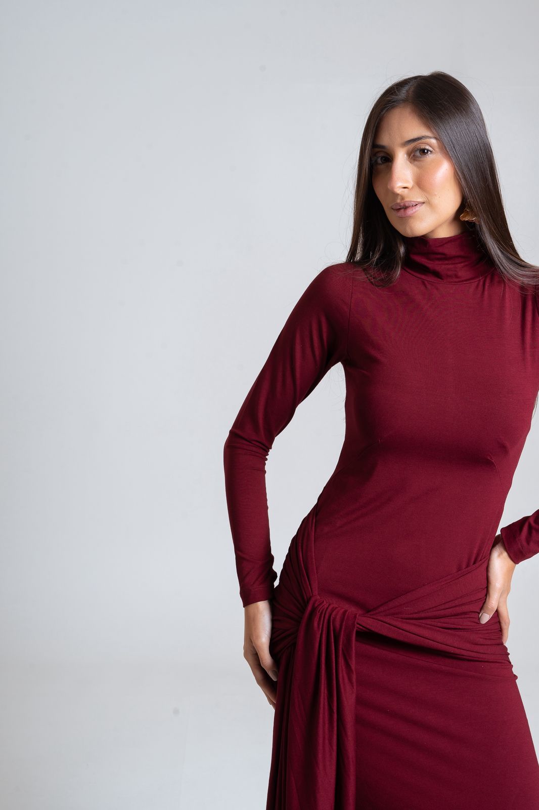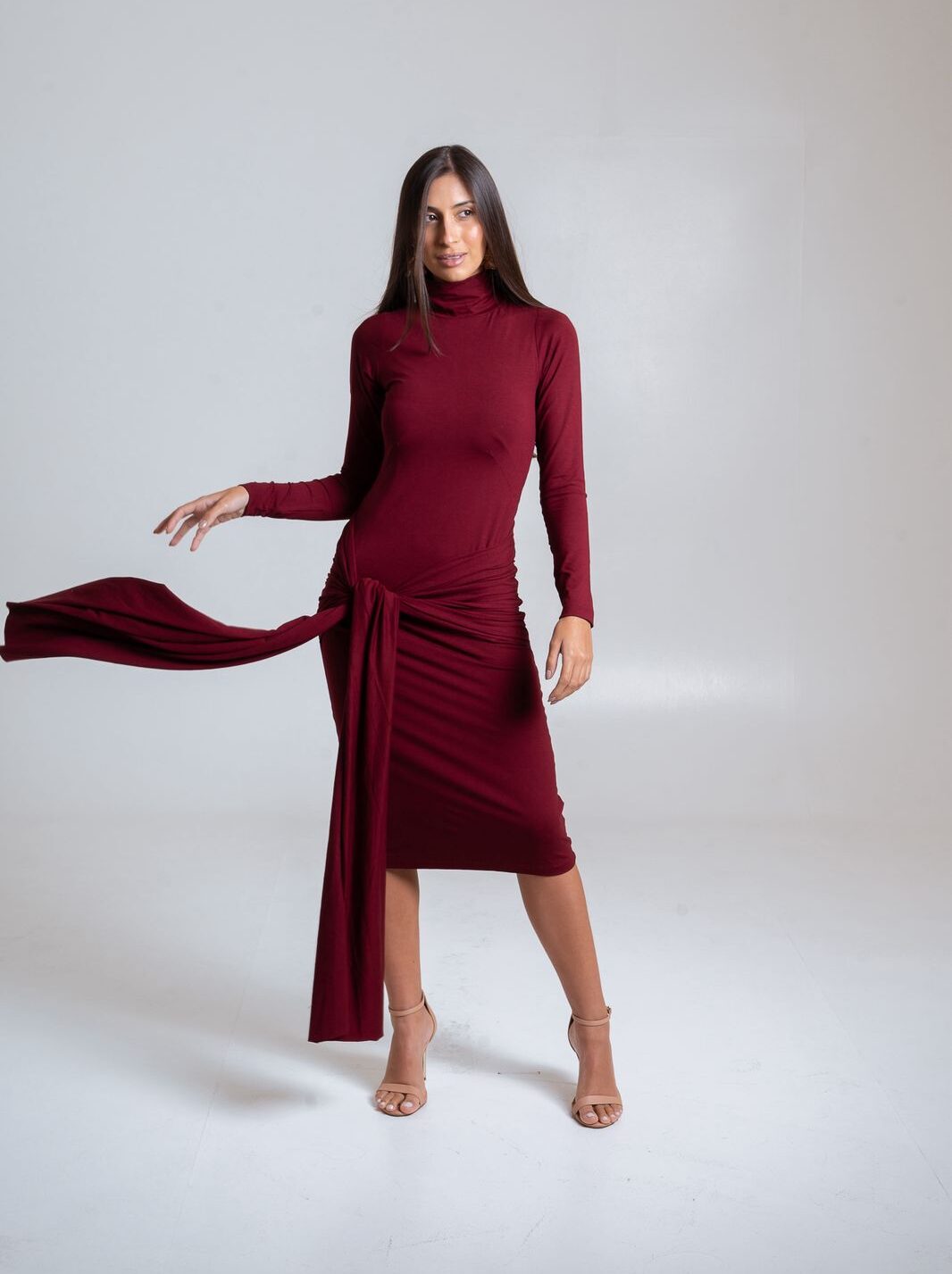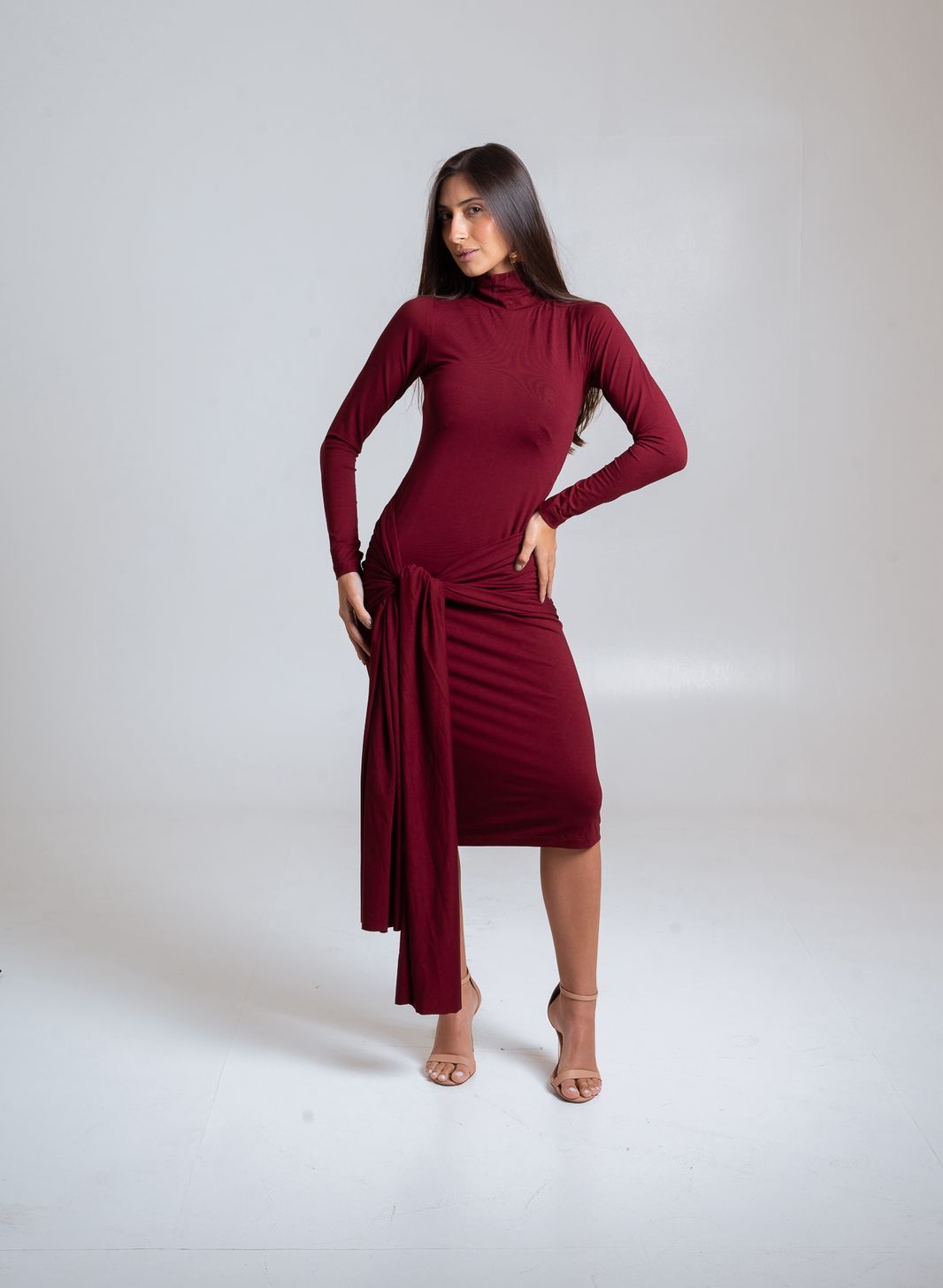 Vestido midi, manga comprida, gola alta, detalhe faixas laterais, modelagem dupla.