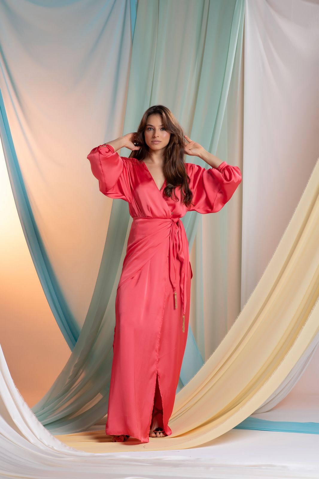 O Vestido Trevo é elegante e moderno. Com modelagem longa, possui fenda frontal e amarração estilo roupão, o que faz com que essa modelagem vista bem em diferentes tipos de corpos.