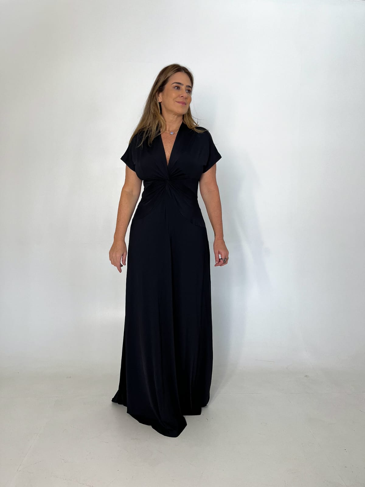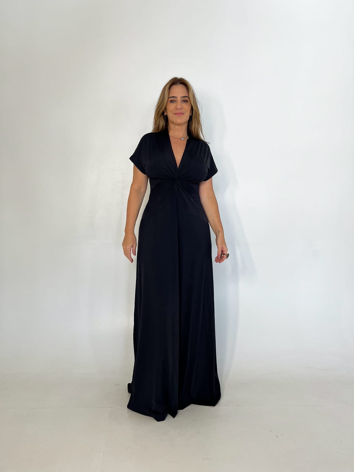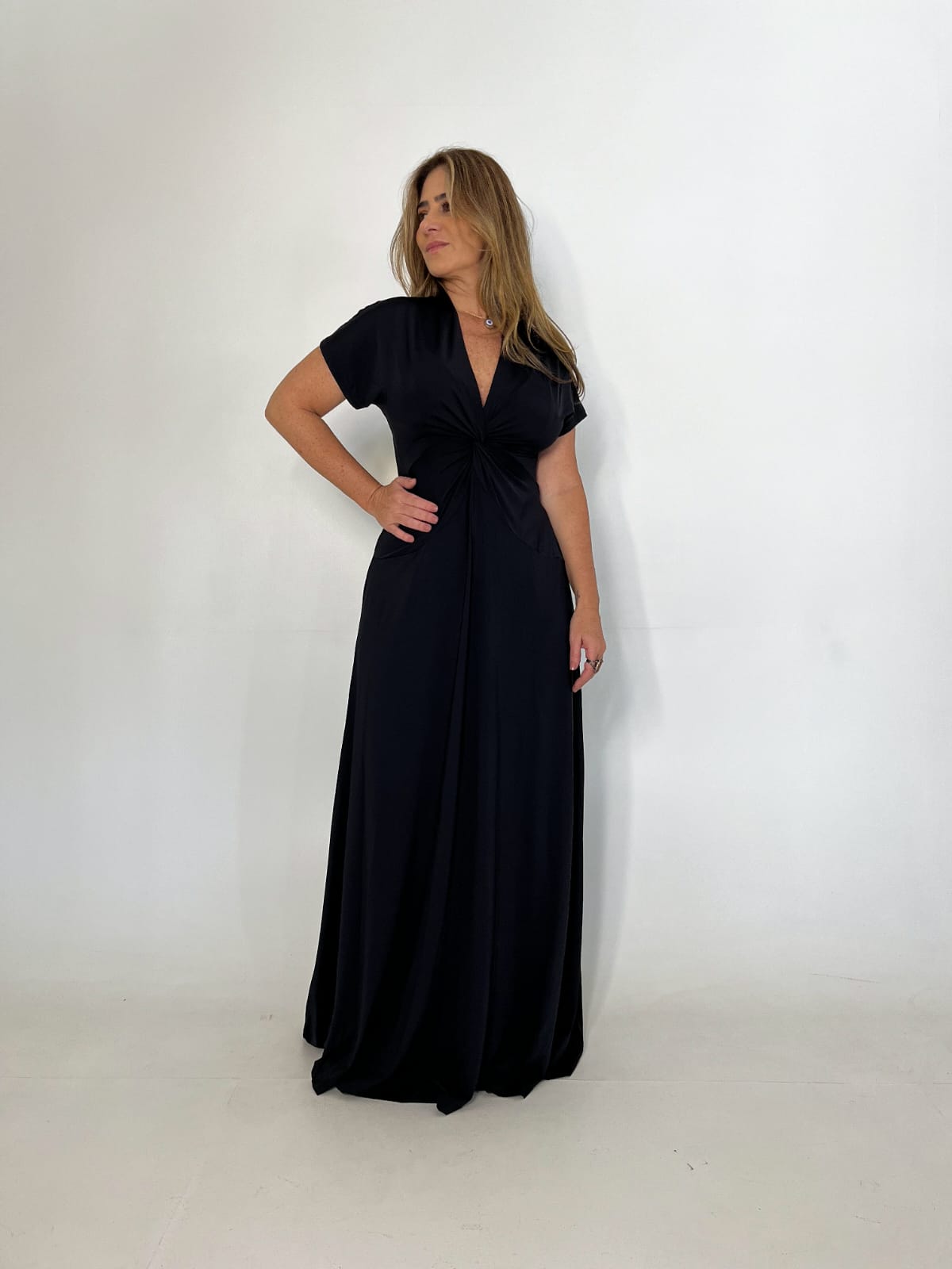 Vestido longo fluity com nó frontal e manga japonesa. Um clássico da Hill que valoriza com um decote lindo.